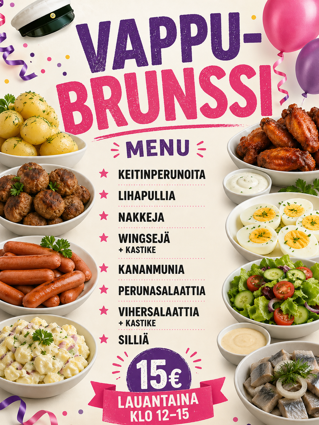 Lauantaina nautitaan kevään mauista klo 12–15 Vappu‑Brunssilla, ja illalla palataan estradille, kun karaoke alkaa klo 20.30. Helmessä vappu ei lopu kesken!