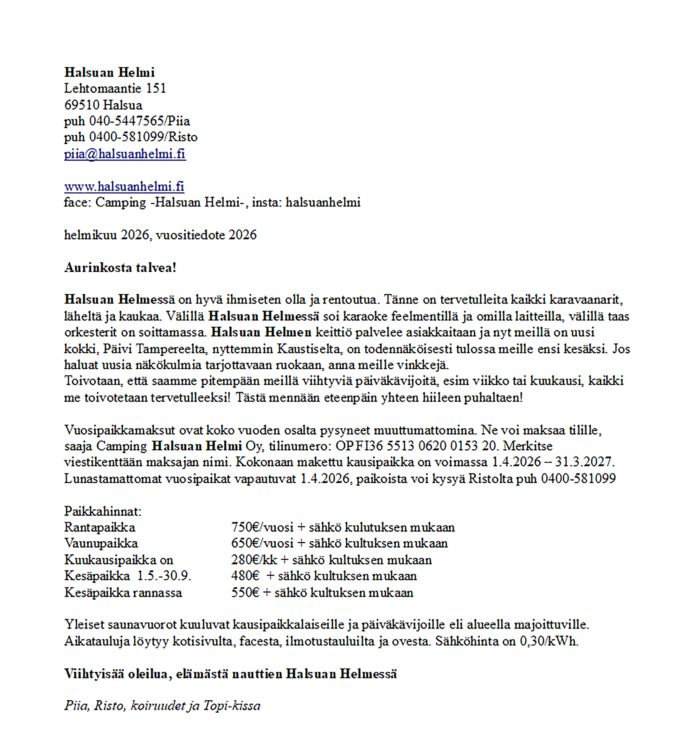 Voit käydä saunomassa ja uimassa: 8€/kerta tai 35€/kk (2026), jolloin voit käydä aina uimassa, kun mieli tekee, vaikka sauna ei olisi lämmin. Muista, että voit maksaa kertamaksun tai kuukausimaksun säästölippaaseen, ravintolan kassaan tai tilille Camping Halsuan Helmi Oy: